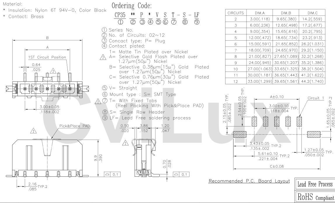 - Product path Home Elgood representationsCviluxCvilux CP35 3.0mm power 3,0mm 1x3pole smd male vertical smd tabs Sn