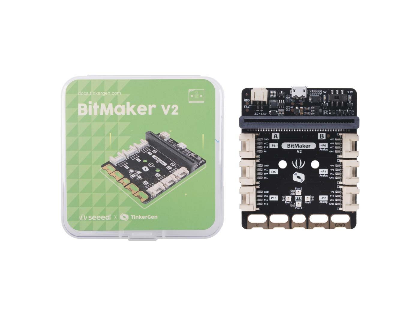 The BitMaker V2 is an upgraded BitMaker expansion board designed for micro:bit where it has been equipped with JST 2.0 battery connector and an updated slot for better holding alligator clips. The usage is of it as straightforward as it can be easily sliding into the micro:bit. With built-in a programmable RGB LED, a power switch, a power indicator, on-board Grove modules connectors, and JST 2.0 battery connector, BitMaker V2 ensures the micro:bit be able to apply various functional Grove series which provides beginners more options in regard to the micro:bit projects, or helps them extend their original demos like adding an external battery to apply additional wireless function.
