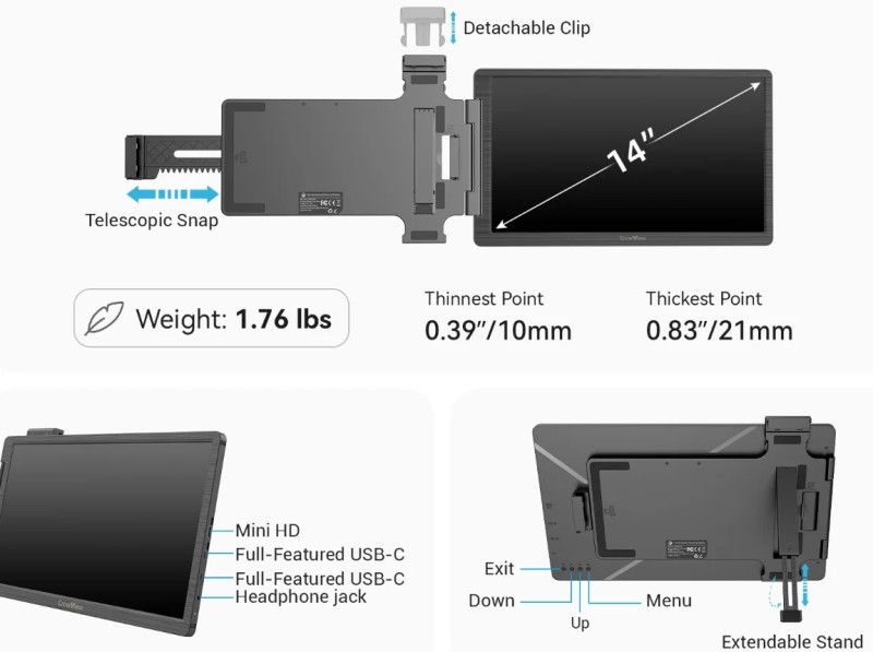 Elecrow CRV00113L - CrowView - ultra-light 14 tuuman additional monitor with USB-C connection that supports laptops with 13-16.5 tuuman displays.