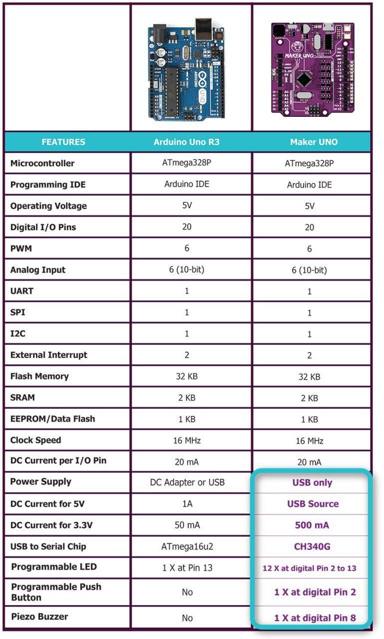 Cytron MAKER-UNO - The Maker UNO is a revised version of the popular Arduino Uno development board. Features include LEDs already on the IO pins, a button, and a buzzer. Designed for educational use. Among other things, there is a spot on the back where a student can write their name.