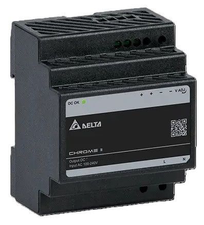 Delta CHROME II series DRC-24V100W1RZ - Insulation class II DIN-rail switch-mode power supply with plastic enclosure.