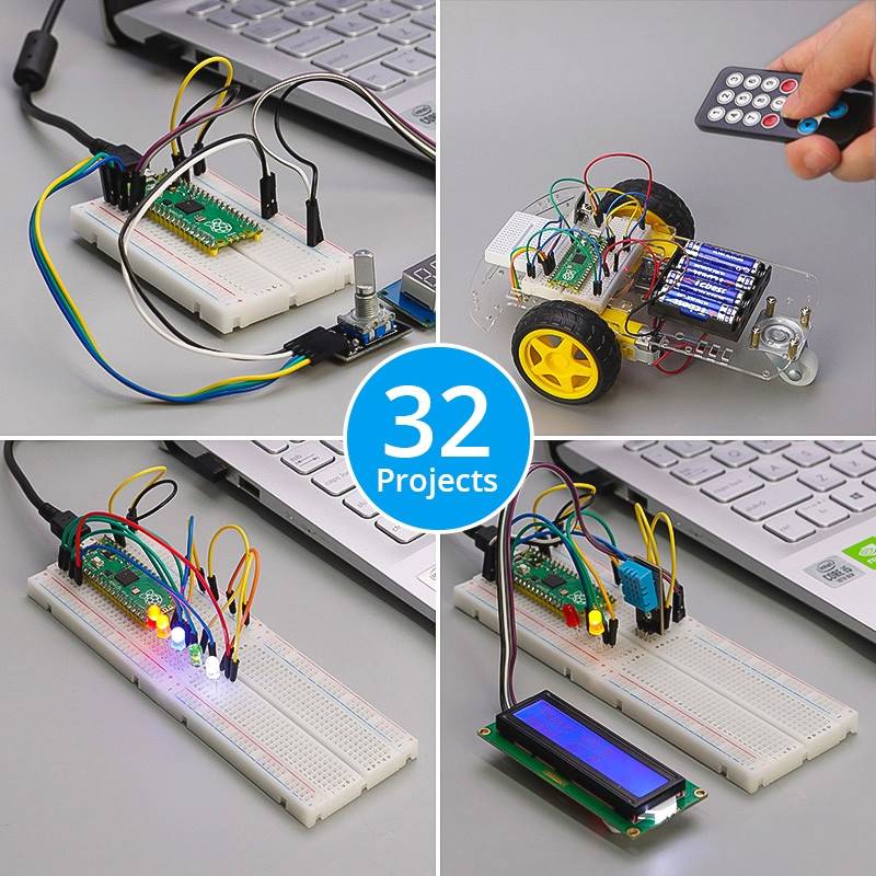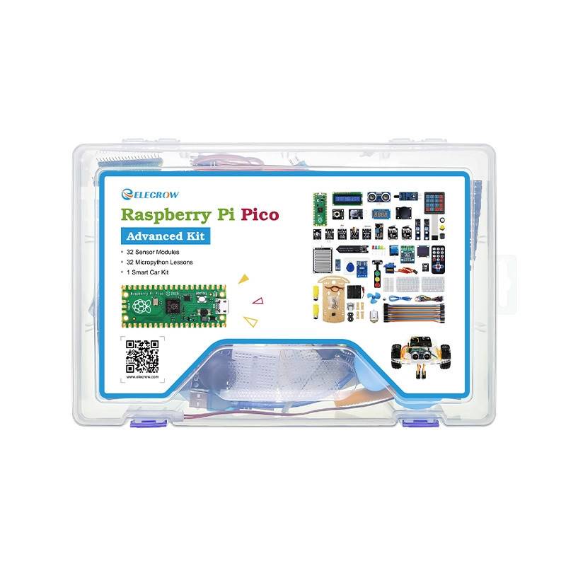 - Click for more details https://www.elecrow.com/raspberry-pi-pico-advanced-kit-with-pico-board-32-modules-and-32-detailed-projects-lessons.html