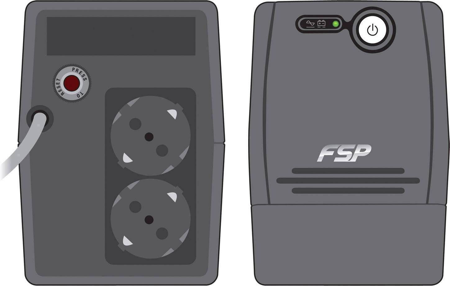 FSP FP800 - 800VA (480W) line-interactive UPS backup power supply with one 12V 9Ah battery. Two AVR voltage-stabilized Schuko outlets.