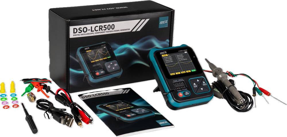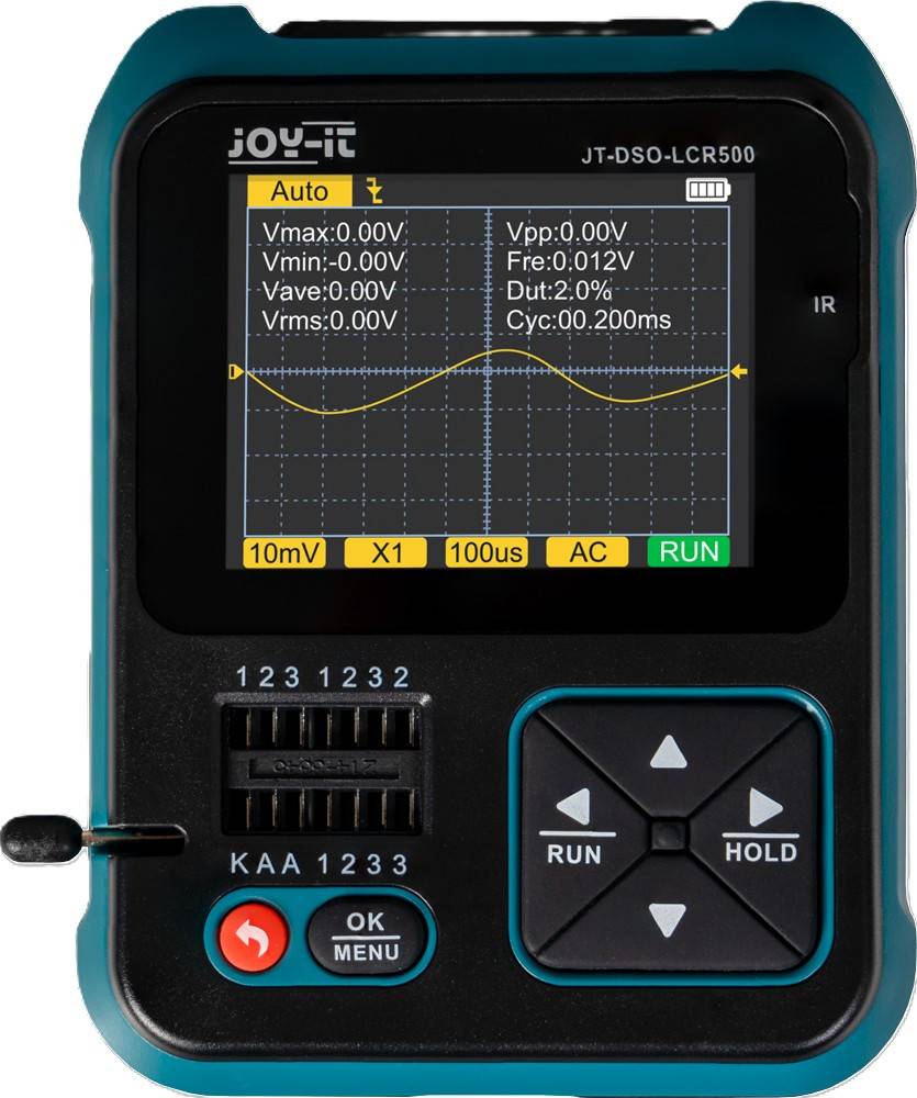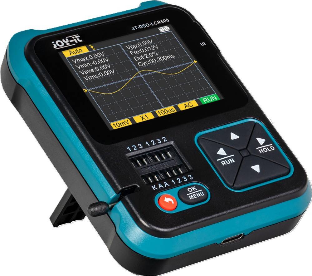 With a digital oscilloscope, determined hobbyists can evaluate time-dependent signals without expensive measurement equipment. The multifunction component tester also enables fast and automatic identification of components. In addition, our DSO-LCR500 device includes other useful functions such as a signal generator, an infrared signal decoder, and measurements of Zener diodes, DS18B20 sensors and DHT11 sensors. The device is equipped with a 1500 mAh rechargeable battery that can be conveniently charged via the USB-C port. An integrated folding stand further facilitates use.