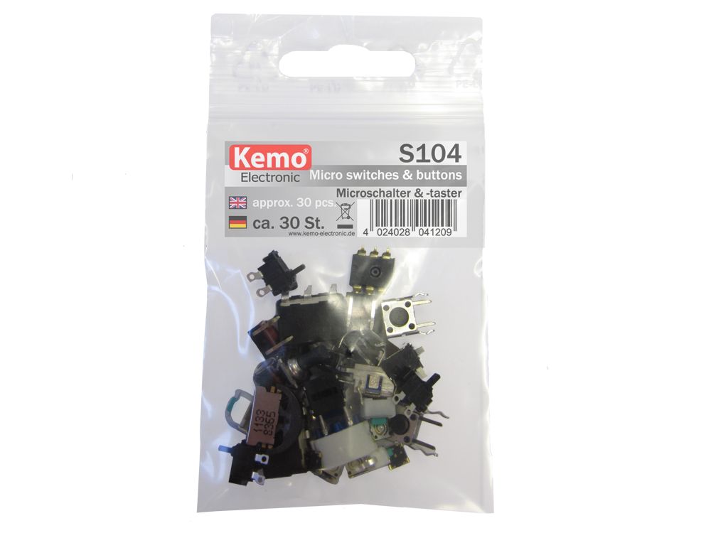 - Click for more details https://www.kemo-electronic.de/en/Components/Elements/Switches/S104-Micro-switches-and-buttons-approx-30-pcs-.php