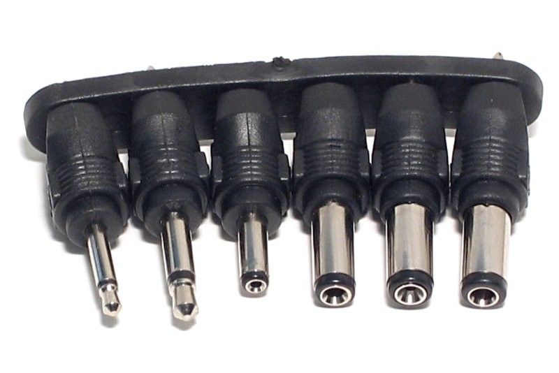 - six most common DC plugs: 2,5 and 3,5 mm mono plugs and 2,1 / 2,5 / 1,35 / 1,5 mm DC connectors