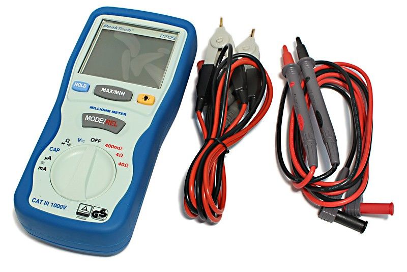 - Product path Home Measuring InstrumentsElectronic Measuring InstrumentsMultimeters Peaktech 2705 MILLIOHM METER