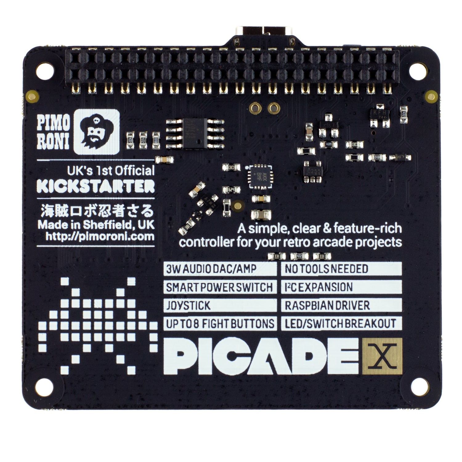 Turn your Raspberry Pi into a retro games console! Picade X HAT includes joystick and button inputs, a 3W I2S DAC/amplifier, and soft power switch. Nice!