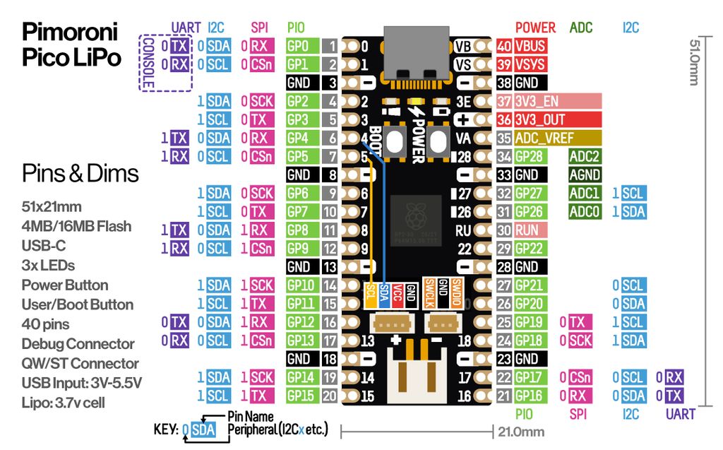 - Virtapainiketta voidaan käyttää myös nollauspainikkeena, jee! Paina sitä kahdesti katkaistaksesi ja palauttaaksesi virran samalla, kun pidät Pimoroni Pico LiPo:n BOOTSEL-painiketta alhaalla päästäksesi käynnistyslataustilaan, eikä kaapeleita tarvitse kytkeä ja irrottaa.
