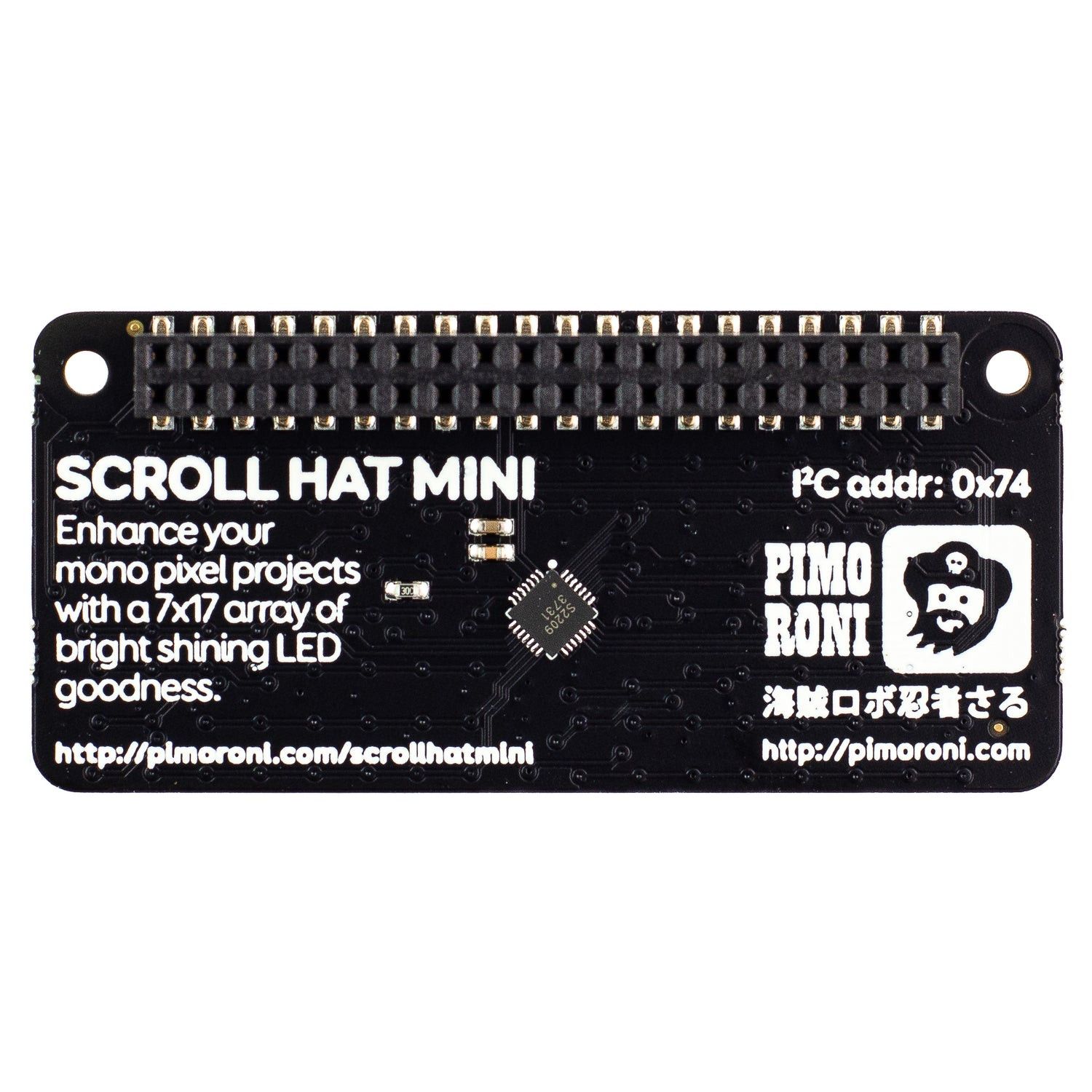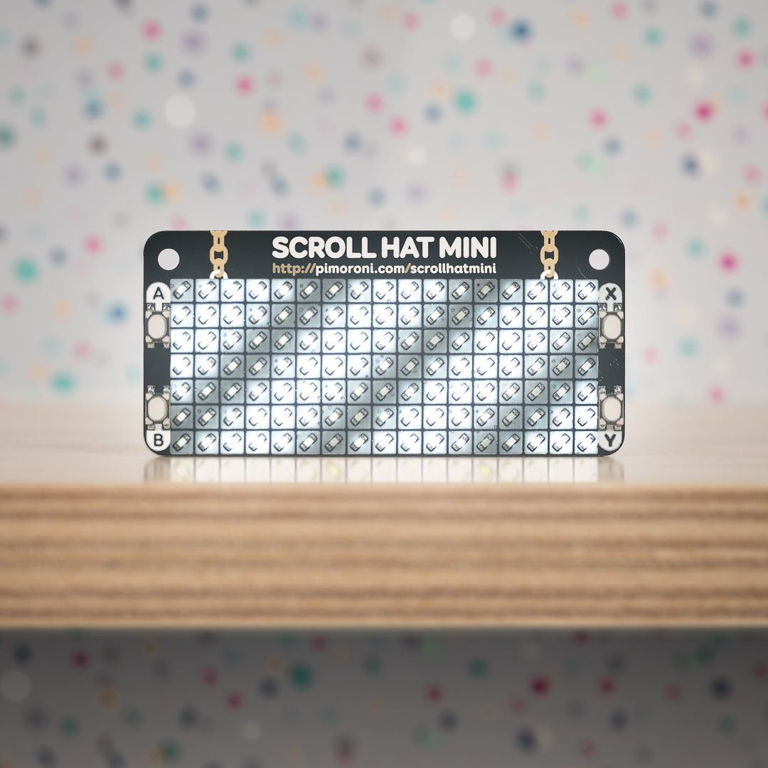 Pimoroni PIM491 - Scroll HAT Mini - A 17x7 matrix of bright white LEDs with individual brightness control, and four handy buttons, made for Raspberry Pi. Just the job for scrolling messages, animations, and more!