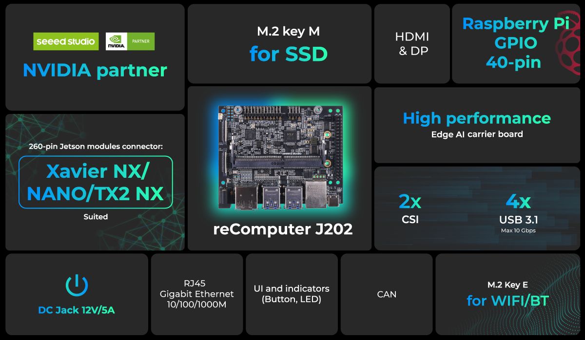 reComputer J202 is a high-performance, interface-rich NVIDIA Jetson Nano / Xavier NX / TX2 NX compatible carrier board, providing HDMI 2.0, Gigabit Ethernet, USB3.1, M.2 key E wifi / BT, M.2 key M, CSI camera, CAN, GPIO, I2C, I2S, Fan, and other rich peripheral interfaces. It has the same functional design and size as the carrier board of NVIDIA® Jetson Xavier™ NX DEVELOPER KIT. There is additional power adapter included.