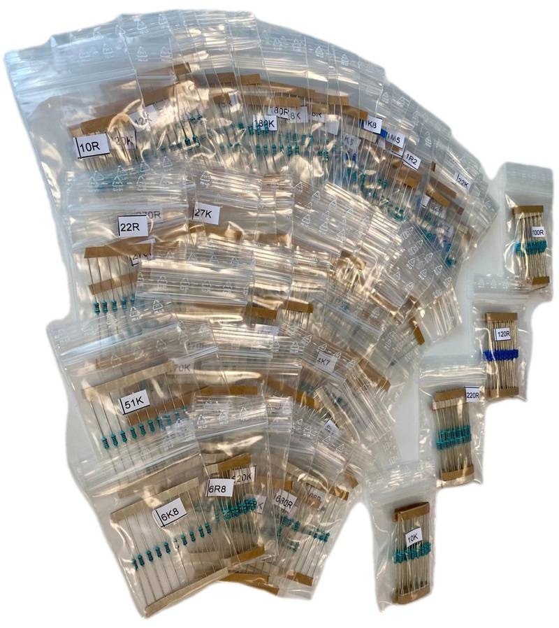 A comprehensive assortment of 0,6W metal film resistors according to the E12 series, from 1,0 ohm to 10 megaohm. A total of 890 pieces, sorted into value-labeled bags.