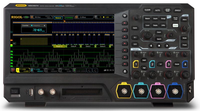 Rigol MSO5074 - four-channel mixed-signal oscilloscope with 70 MHz bandwidth, max 8GSa/s sampling.