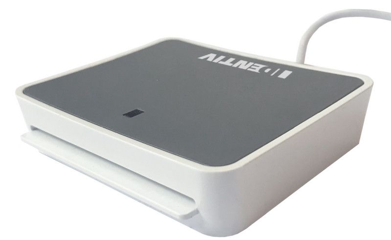 Identiv uTrust 2700R ID card reader with USB C connector. The device, via its own driver, supports all standard-compliant chip cards and smart card applications.