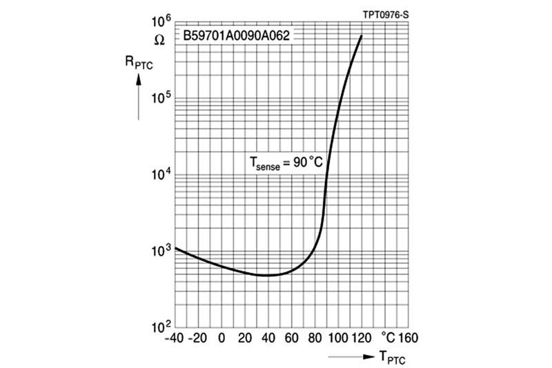 The series resistance of this PTC resistor rises rapidly from kilo-ohms to mega-ohms when the temperature exceeds the threshold. Used e.g. to detect over-temperature.