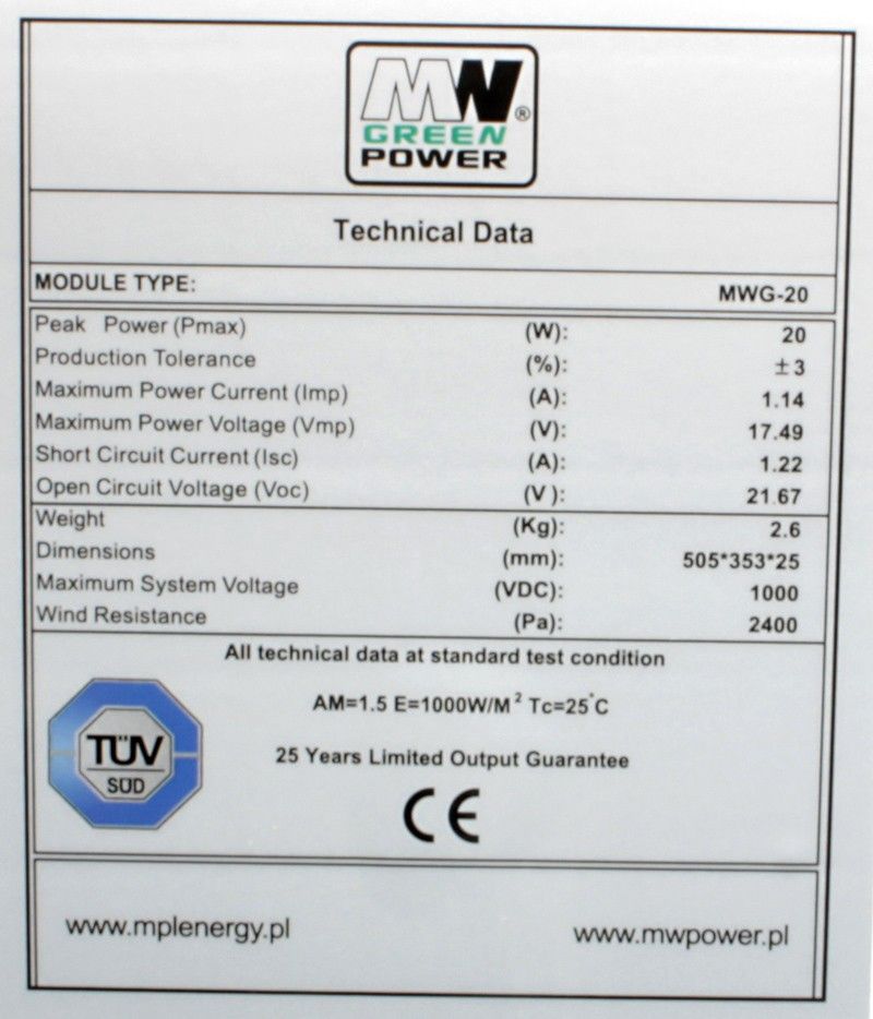 - Manufacturer's model MW Green Power MWG-20
