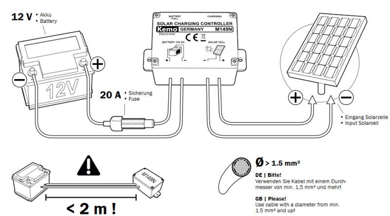 - Click for more details https://www.kemo-electronic.de/en/Light-Sound/Solar/M149N-Solar-Charging-Controller-12-V-DC-10-A-20-A.php