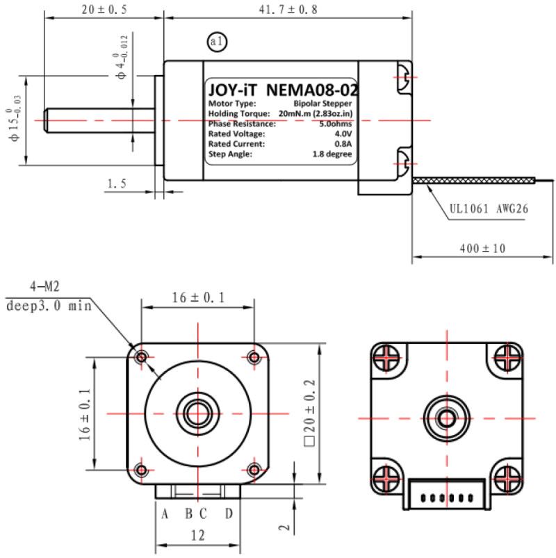 Joy-IT NEMA08-02 - 20SHD0101-20 is a bipolar stepper motor in the small NEMA08 size. Shaft Ø 4 x 18,5 mm. Housing 20 x 20 x 42 mm.