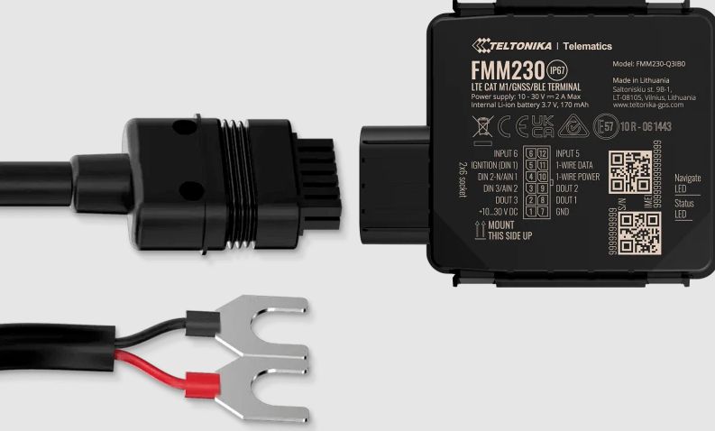 Teltonika FMM230 - is a GNSS- and GSM-equipped tracking device that can collect the device's coordinates and transmit them to a server via the GSM network. It is attached directly to the battery with the fork connector included in the package.