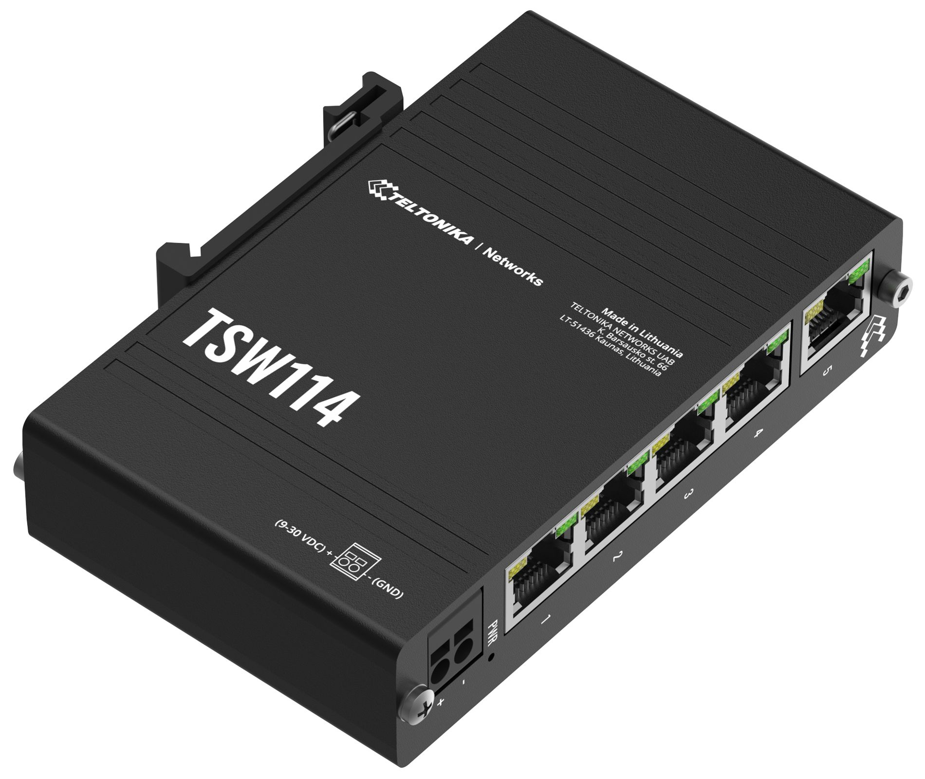 Teltonika TSW114 - DIN-rail mountable, industrial-grade unmanaged gigabit Ethernet switch with 1+4x1GB RJ45/Ethernet ports