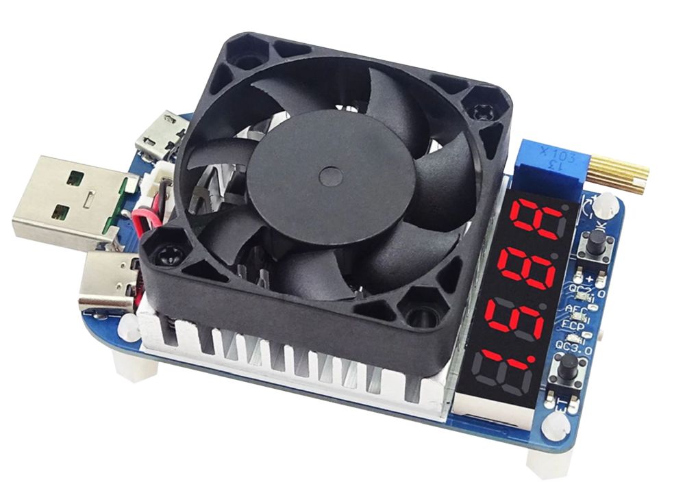 USB charging resistor up to 35W, adjustable via built-in trimmer, LCD display of actual current strength, buttons to switch the load on/off, simulation of various charging electronics: QC2.0(5V,9V,20V),QC3.0,FCP,AFC9V.